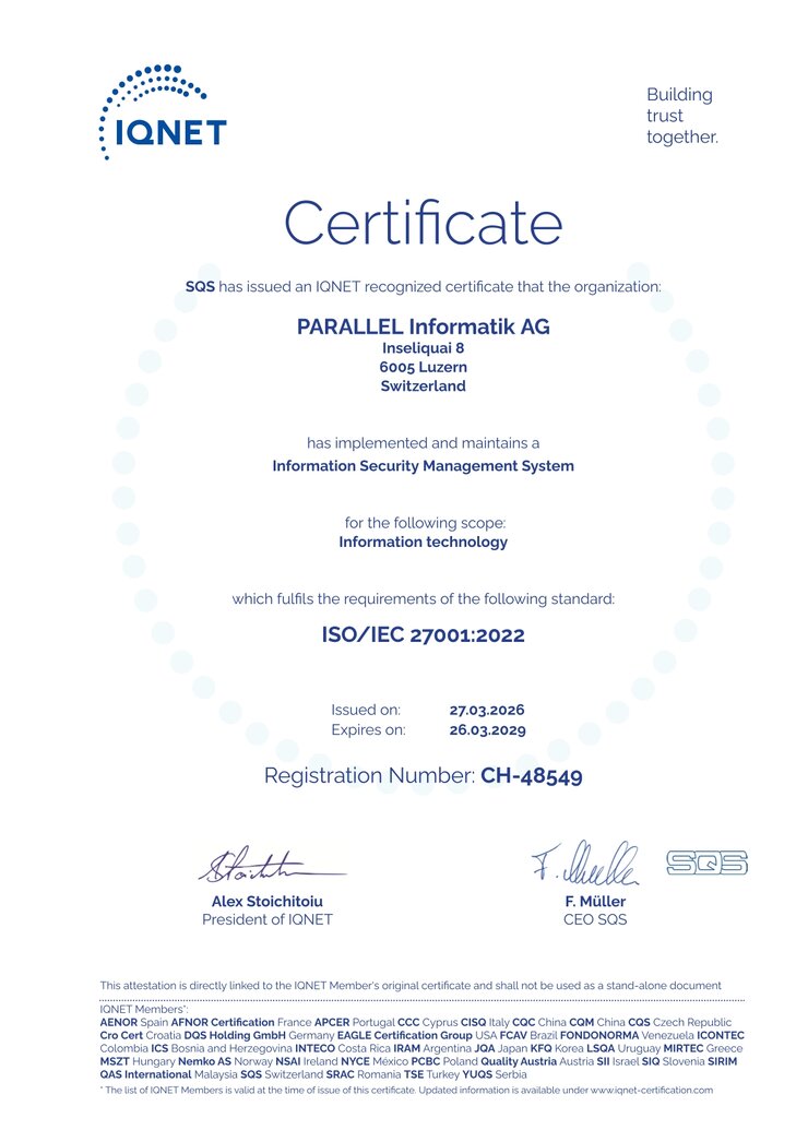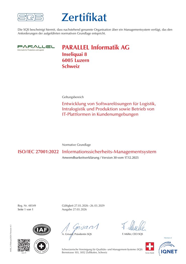 Die PARALLEL Informatik AG ist nach ISO 27001 zertifiziert im Bereich Entwicklung von Softwarelösungen für Logistik, Intralogistik und Produktion sowie Betrieb von IT-Plattformen in Kundenumgebungen.